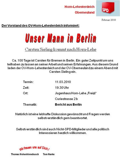 Dieses wird eine öffentliche Veranstaltung sein, die allen SPDlern, Nicht-SPDlern, politisch Interessierten, Freunden und Nachbarn offen steht.