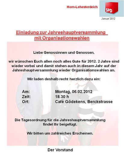 Die Einladung mit Tagesordnung bekommt Ihr, wie immer per E-Mail und Post in den nächsten Tagen.