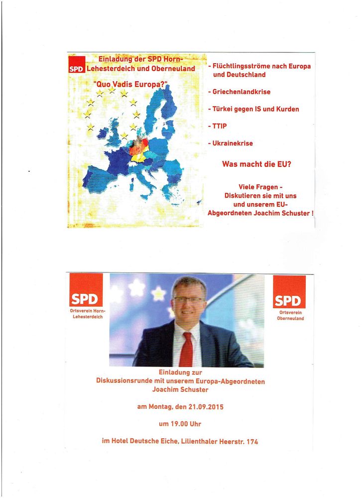 Die SPD-Ortsvereine Horn-Lehesterdeich und Oberneuland laden alle Interessierten zur Diskussionsrunde mit Joachim Schuster (MdEP) ein: