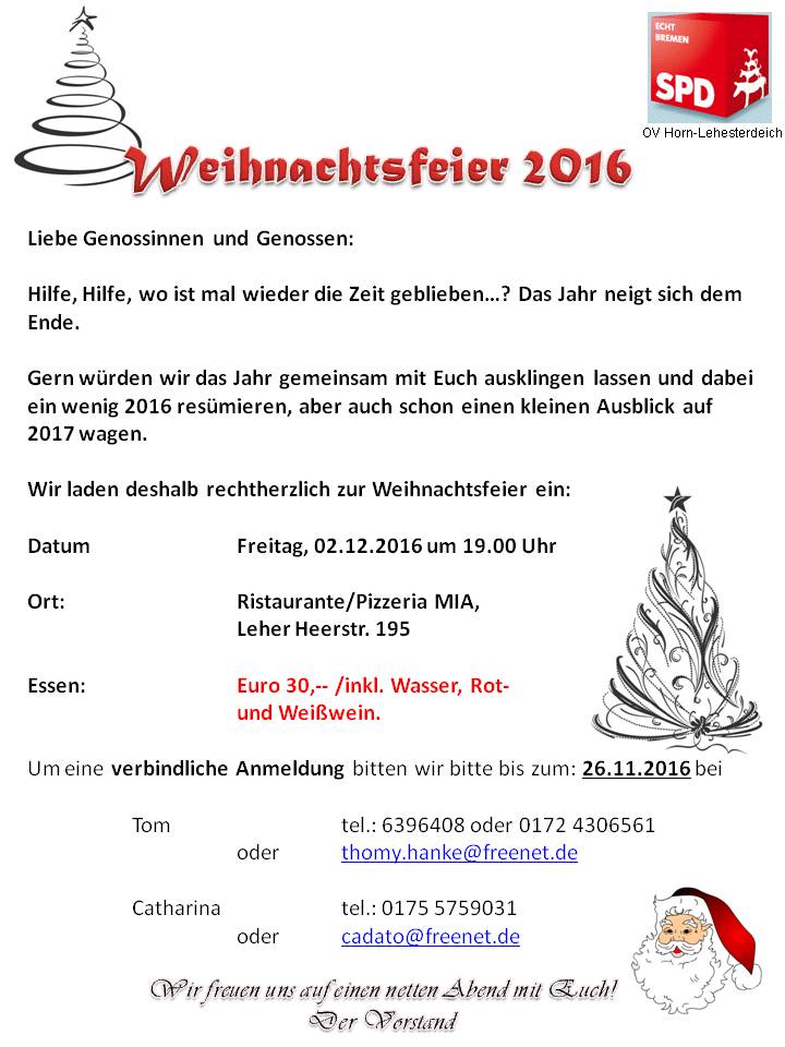 hier findet Ihr die Einladung zur Weihnachtsfeier des Ortsvereins Horn-Lehesterdeich. In diesem Jahr haben wir eine wunderbare Location für unser besonderes Event gefunden.