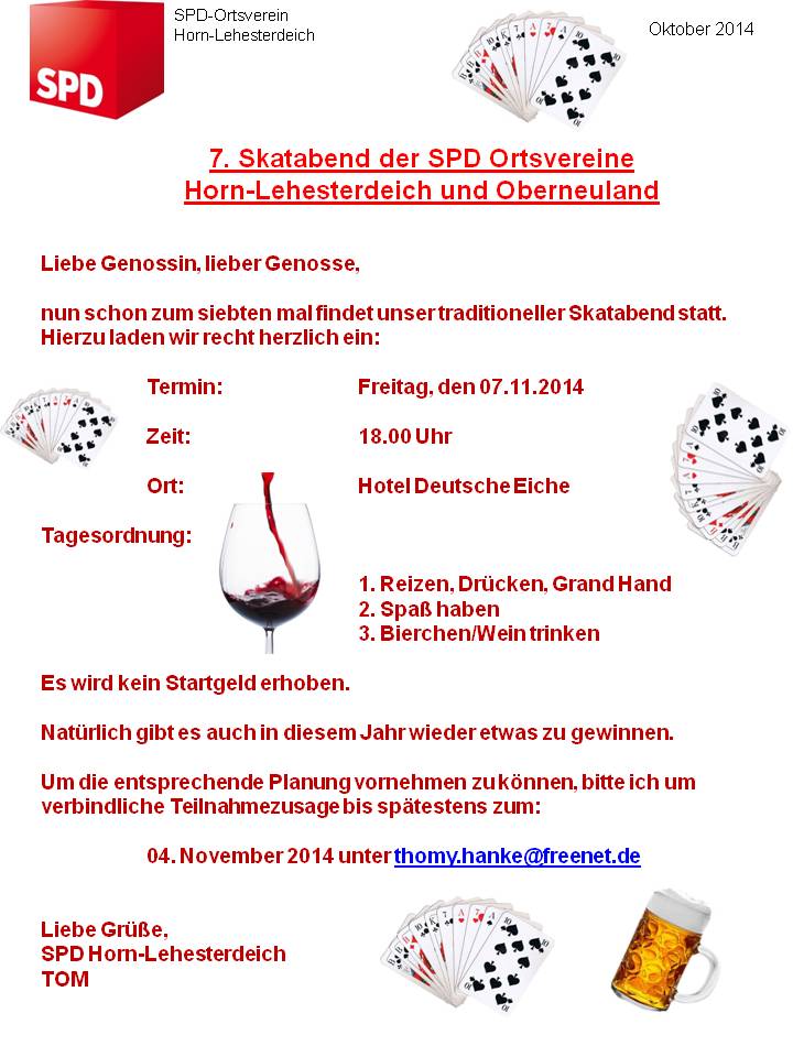 hier die Einladung zum mittlerweile bereits 7ten Skatabend der SPD Ortsvereine Horn-Lehesterdeich und Oberneuland.