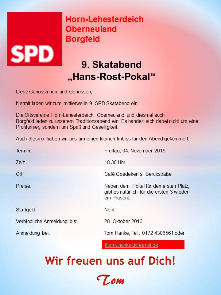 am Freitag, den 04.11.2016 findet nun schon zum neunten Mal unser traditioneller Skatabend statt. Diesmal ist auch der Ortsverein Borgfeld mit dabei.