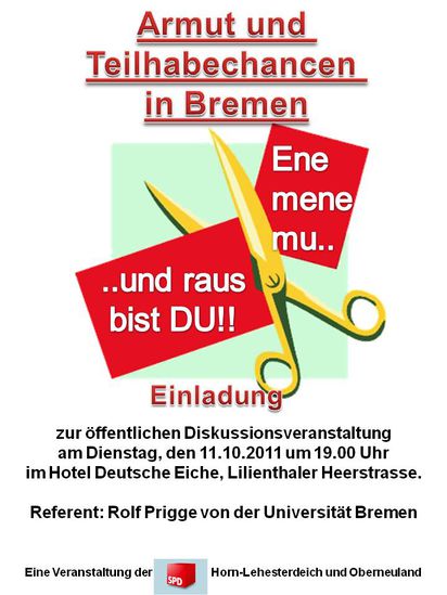 Am Dienstag, den 11.10.2011 werden wir gemeinsam mit dem SPD Ortsverein Oberneuland die Veranstaltung "Armut und Teilhabechancen in Bremen" im Hotel Deutsche Eiche durchführen.