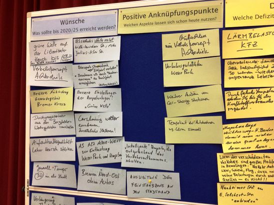 Am 17.01.2013 fand im Bürgerzentrum Neue Vahr die Regionalkonferenz zum Vekehrsentwicklungsplan für den Nord-Osten statt. Für alle Verkehrsteilnehmer sind Mängel herausgearbeitet worden. Gleichzeitig wurden aber auch die Chancen herausgestellt. Die vier Bereiche sind: