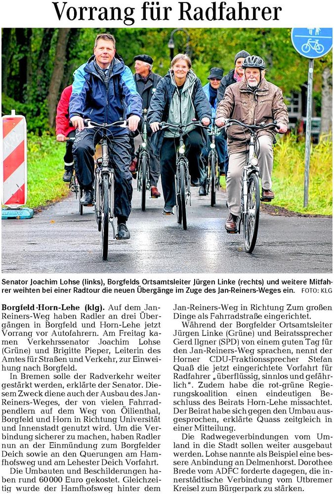 Stadtteilkurier von gestern - Man traut seinen Augen nicht. Ganz Horn-Lehe muss es aus der Zeitung erfahren. Wir hatten ja nun schon berichtet. Da wird dann aber jetzt ganz still und heimlich mit dem Fahrrad über den Jan-Reiners-Weg gefahren, Horn-Lehe mal eben ausgebootet. Diese grüne Ignoranz spottet doch jetzt jeder Beschreibung und die liest sich dann siehe Artikel.