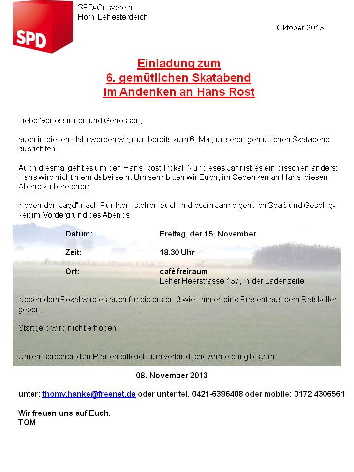Ihr findet hier die Einladung zum 6. gemütlichen Skatabend der Ortsvereine Horn-Lehesterdeich und Oberneuland.