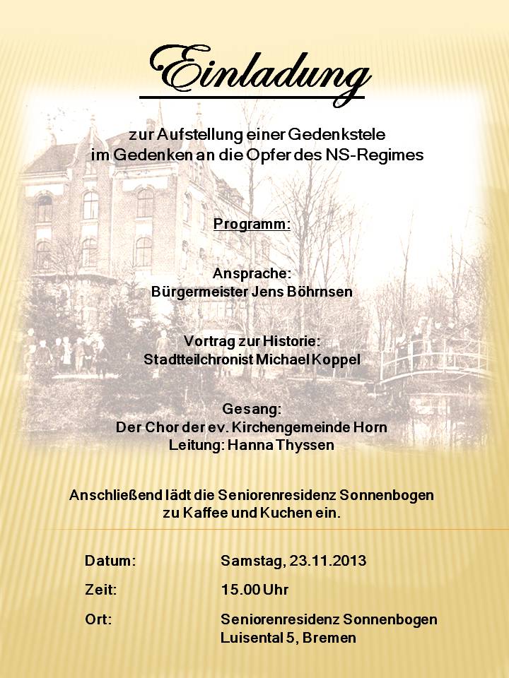 Die Stele wurde vom Beirat Horn-Lehe finanziert und wird im Rahmen einer kleinen Feier dort im November aufgestellt.