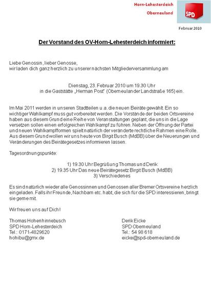 hiermit laden wir zu einer gemeinsamen und öffentlichen Mitglieder-versammlung des OV Oberneuland ein.