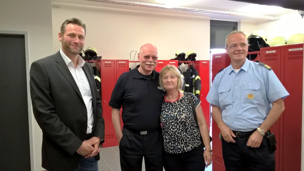 Auch die Spinde sind in Feuerwehrrot! Vier der Hauptbeteiligten am Gelingen der neuen Feuerwehrhalle in der Herrenumkleidekabine mit außerordentlich zufriedenen Gesichtern.
