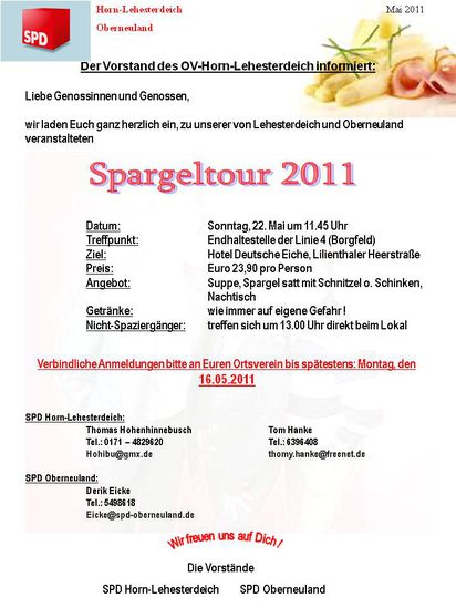 am 22.05.2011 ist es so weit - Wahl in Bremen. Diesen Tag wollen wir auch diesmal zusammen mit unserem befreundeten Ortsverein Oberneuland begehen.....