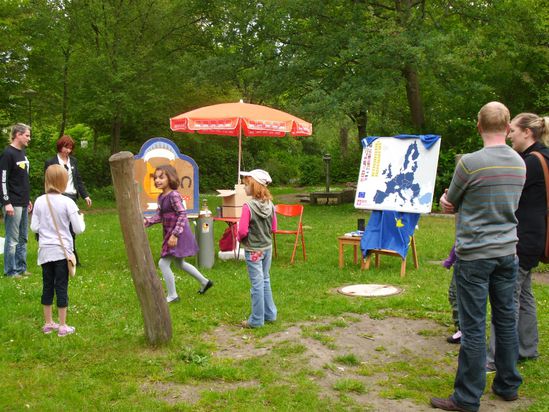Auch die SPD hatte 2 Stände plaziert: Das Europa-Spiel zeigte auch so manch Erwachsenen, das ganz besonders die neuen Länder noch nicht so eindeutig sind. Darüber hinaus "flogen" für die Kids Schokoküsse. Die Schokokusswurfmaschine erfreute sich hoher Beliebtheit.