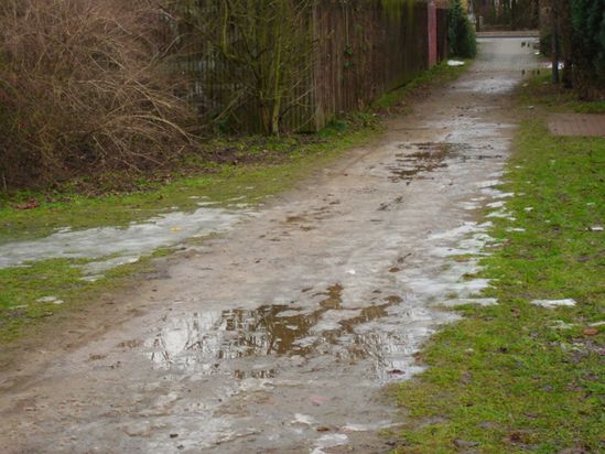 ...stehen bei Tauwetter unter Wasser und sind dann schlammig und glitschig. Diese Wege werden eigentlich von Schülern, älteren Menschen teilweise mit Rollatoren sowie von Müttern mit kleinen Kinder auf dem Weg zum Holler Wichtel genutzt. Keine Möglichkeit "unbeschädigt" diese Wege zu passieren.