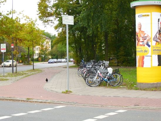 Hier wird es eng..... - An der Ecke Kopernikusstrasse und Lilienthaler Heerstrasse steht ein Schild im Weg. Nach dem Überqueren der Lilienthaler Heerstrasse an der Ampel mit dem Ziel Kopernikusstrasse wird es für Fußgänger und Fahradfahrer verdammt eng. Ganz besonders, da auch der Fahrradständer immer gefüllt ist. Richtig schwierig wird es, wenn an der Bushaltestelle (direkt am Anfang der Kopernikusstrasse) auch noch Personen aus dem Bus steigen.