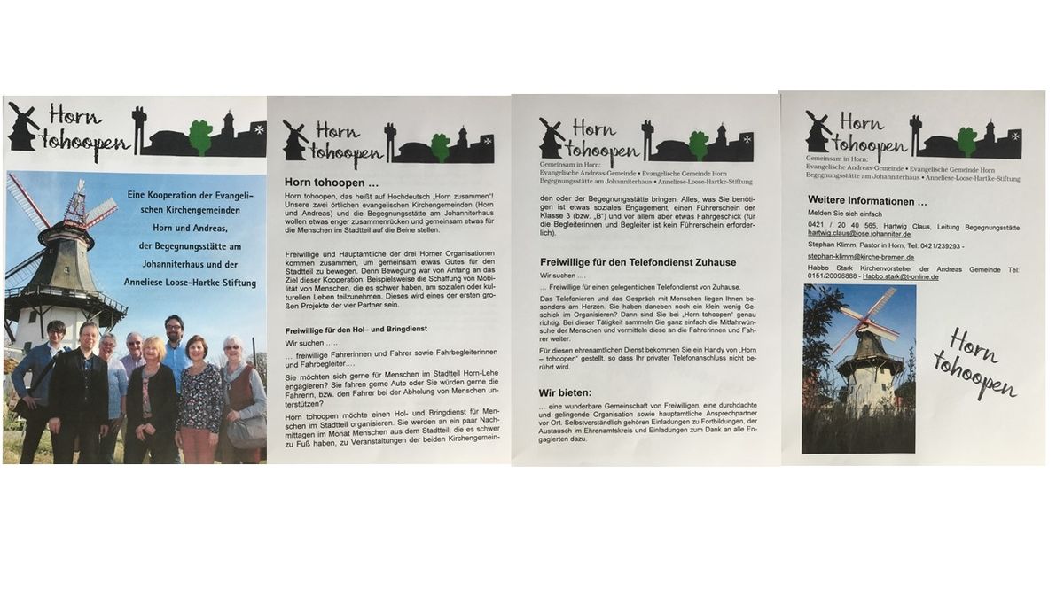 HORN TOHOOPEN - eine Kooperation, die im Ausschuss Soziales im Beirat Horn-Lehe seine Geburtsstunde hatte. Keine Mobilität im Alltag? Für manche ältere Mitbürgerinnen und Mitbürger ist Mobilität nicht selbstverständlich. Aber Mobillität macht Begegnung möglich. Also was tun? "Wir wollen mit dieser Kooperation Menschen zusammenbringen", so Catharina Hanke.