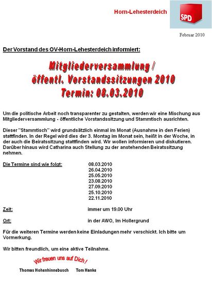 Um die politische Arbeit noch transparenter zu gestalten, werden wir eine Mischung aus Mitgliederversammlung - öffentliche Vorstandssitzung und Stammtisch ausrichten.