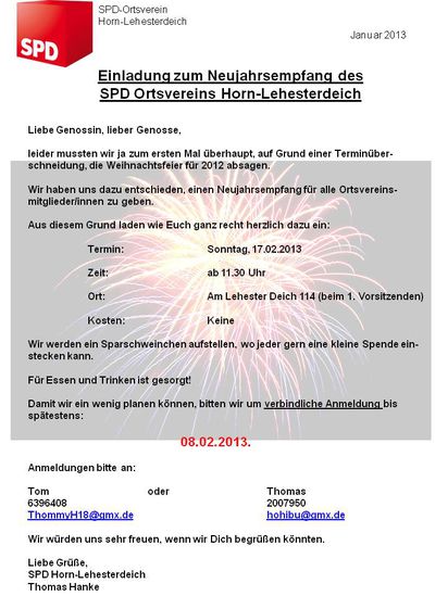 Wir haben uns dazu entschieden, am Sonntag, den 17.02.2013 ab 11.30 h einen Neujahrsempfang für alle Ortsvereinsmitglieder zu geben.