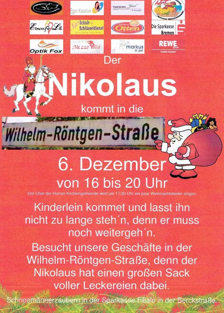 Am Donnerstag, den 06.12.2018 kommt der Nikolaus in die Wilhelm-Röntgen-Strasse. Die Aktion unterstützt der SPD Ortsverein Horn-Lehesterdeich natürlich.