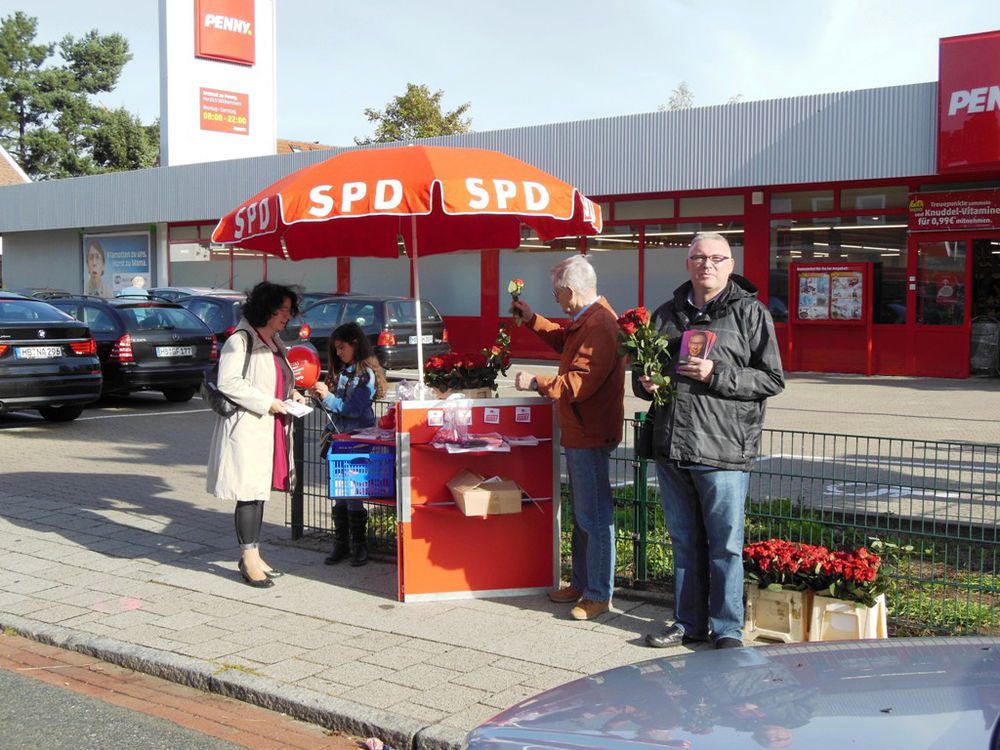 Natürlich war auch der Ortsvereinsstand in der Edisonstrasse mit reichlich roten Rosen ausgestattet. Hier waren Frank, Manfred, Thomas aktiv. Nach erfolgreicher Hausbesuchstour Im Hollergrund hat auch Catharina noch aktiv in das Geschehen eingegriffen. Auch diesmal hatten wir kompetente Unterstützung: Yasemin aus Peers Kompetenzteam war zunächst am Stand und hat dann Catharina auf Hausbesuchstour unterstützt.