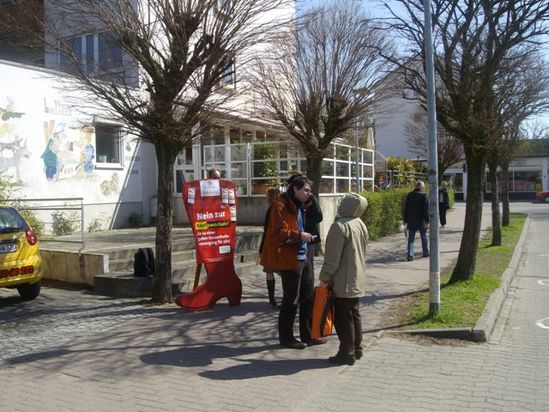 Der Rote Schuh war im Stadtteil Horn-Lehe wieder einmal auf Reisen. Samstag, den 17.04.2010 stand er -zum Thema - Nein zur Kopfpauschale - bei REWE in der Wilhelm-Röntgen-Strasse.