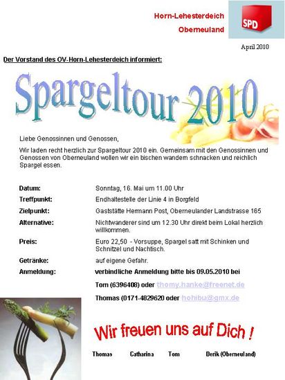 auch dieses Jahr werden wir mit dem befreundeten Nachbarortsverein Oberneuland "spargeln" gehen.