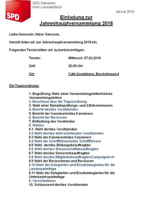am Mittwoch, den 07.02.2018 findet die Jahreshauptversammlung des SPD Ortsverein Horn-Lehesterdeich statt. Es finden dann auch die Organisationswahlen statt.