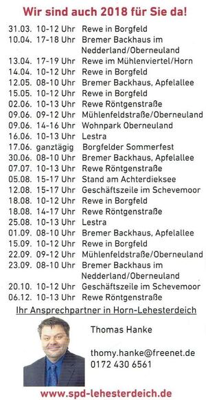 In den nächsten Wochen finden Sie auch einen Flyer im Postkasten mit diesen Terminen, sowie mit weiteren Terminen, der SPD Ortsvereine Borgfeld, Oberneuland und Horn-Achterdiek.