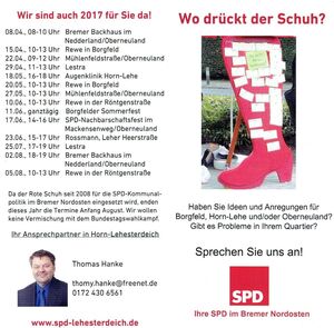 Bereits 2016 zog der "Rote Schuh" der SPD durch die Stadtteile im Nordosten. Die Vorstände der SPD Ortsvereine aus Borgfeld, Horn-Achterdiek, Horn-Lehesterdeich und Oberneuland haben beschlossen, dass der Bürgerdialog "Wo drückt der Schuh?" auch in 2017 weitergeht.