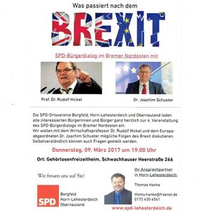 Am 9. März fand die mit unserem Europaabgeordneten Joachim Schuster und Prof. Rudolf Hickel eine Diskussionsrunde zum Thema "BREXIT - Was kommt danach? /Was heißt das?" statt. Unter dem Motto "SPD Bürgerdialog im Nordosten" haben die SPD Ortsvereine Horn-Achterdiek, Horn-Lehesterdeich, Borgfeld und Oberneuland bereits die vierte Veranstaltung durchgeführt.