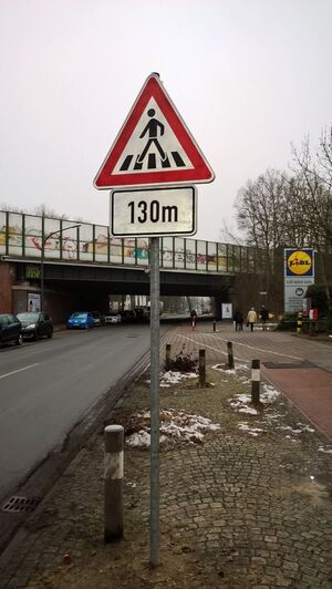 Aus Richtung Oberneuland kommend wurde ein weiteres Hinweisschild, dass auf den Zebrastreifen hinweißt, aufgestellt. Es zeigt den Verkehrsteilnehmern an, dass in 130 m ein Überweg kommt. Aus der anderen Richtung wird ebenfalls auf den Zebrastreifen in 80 m hingewiesen.