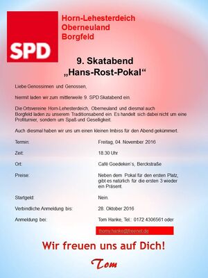 am Freitag, den 04.11.2016 findet nun schon zum neunten Mal unser traditioneller Skatabend statt. Diesmal ist auch der Ortsverein Borgfeld mit dabei.