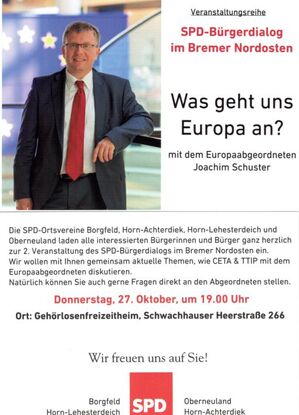 Am heutigen Donnerstag findet die öffentliche Diskussionsrunde unter der Veranstaltungsreihe der SPD NordOst zum Thema "Europa" mit Joachim Schuster, Bremens Europaabgeordneten statt. Dazu wurden insgesamt ca. 3500 Flyer vorbereitet, die in den drei Stadtteilen Oberneuland, Horn-Lehe und Borgfeld verteilt wurden.