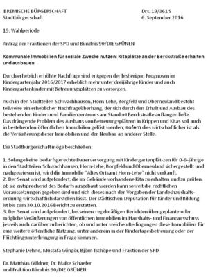 Der Ortsverein begrüßt den Antrag nachhaltig, da Horn-Lehe dringend auf die Kita Berckstrasse angewiesen ist.
