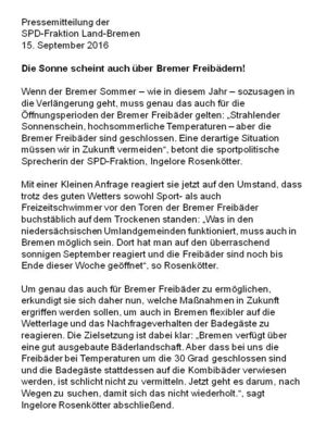 Der Ortsverein Horn-Lehesterdeich begrüßt die Anfrage von Ingelore Rosenkötter zum Thema Bremer Freibäder.