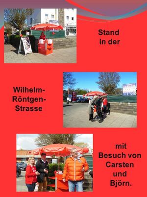 Die Sonne lacht bereits am frühen Morgen, als Barnabas und Tom die Stände ins Auto laden. Wahlstandaufbau zunächst in der Wilhelm-Röntgen-Strasse und anschließend in der Edisonstrasse. Team Edisonstrasse: Catharina, Ilse, später abgelöst von Hans-Dieter, und Marcel. Team Wilhelm-Röntgen-Strasse: Barnabas und Tom. Und gleich zum Auftakt gibt es an beiden Ständen Besuch von 2 Hochkarätern......