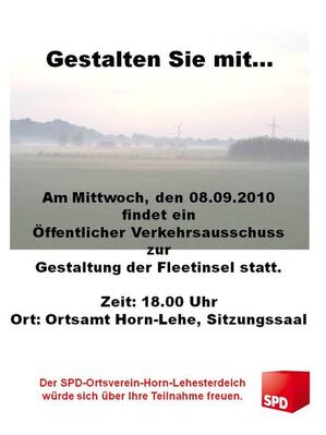 Am Mittwoch, den 08.09.2010 um 18.00 Uhr findet eine öffentliche Sitzung des Verkehrsausschusses im Ortsamt, Sitzungssaal statt. U.a. wird auch das Thema: Fleetinsel behandelt.