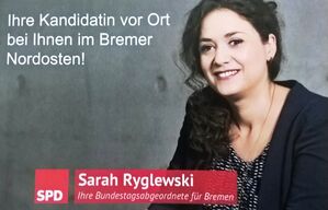 Die Diplom-Politikwissenschaftlerin Sarah Ryglewski ist seit Juli 2015 Mitglied des Bundestages, sie war für Carsten Sieling nachgerückt, der seit vergangenem Jahr Bremens Bürgermeister ist. Ryglewski ist seit 2001 Mitglied der SPD, seit 2010 ist sie stellvertretende SPD-Landesvorsitzende und war zuvor Juso-Landesvorsitzende. Bevor sie in den Bundestag wechselte, war sie von 2011 an Mitglied der Bremischen Bürgerschaft.