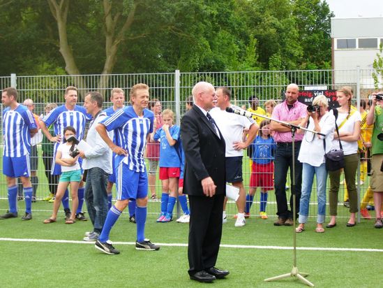 Uli Mäurer eröffnet den Sportpark Horn-Lehe. In seiner kurzen Ansprache dankt er allen Sponsoren und Unterstützern und im besonderen Jörg Wontorra. Sein Engagement hat diesen wunderschönen Sportpark erst möglich gemacht. Im Anschluss dankte auch Eva Bärwolf den Sponsoren für das tolle Gelände. Herr Ahrens vom Ortsamt wies in seiner kurzen Ansprache auch noch einmal darauf hin, das dies der erste und einzige Versuch ist und wies, bzw. mahnte die Jugendlichen, mit dem Sportpark pfleglich umzugehen. "Es wird sicherlich keiner Geld geben oder in die Hand nehmen, wenn hier etwas kaputt geht, oder gar mutwillig zerstört wird", so Ahrens. Recht hat er, das Gelände und die gesamte Anlage ist einfach traumhaft und wir hoffen, das dieser Sportpark lange so aussieht.