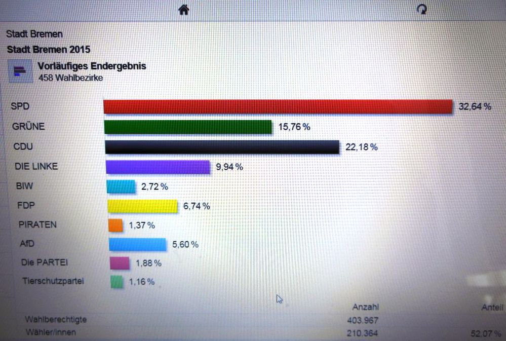 hier finden/findet Sie/Ihr das vorläufige Endergebnis, festgestellt durch den Landeswahlleiter, der Bürgerschaftswahl 2015.