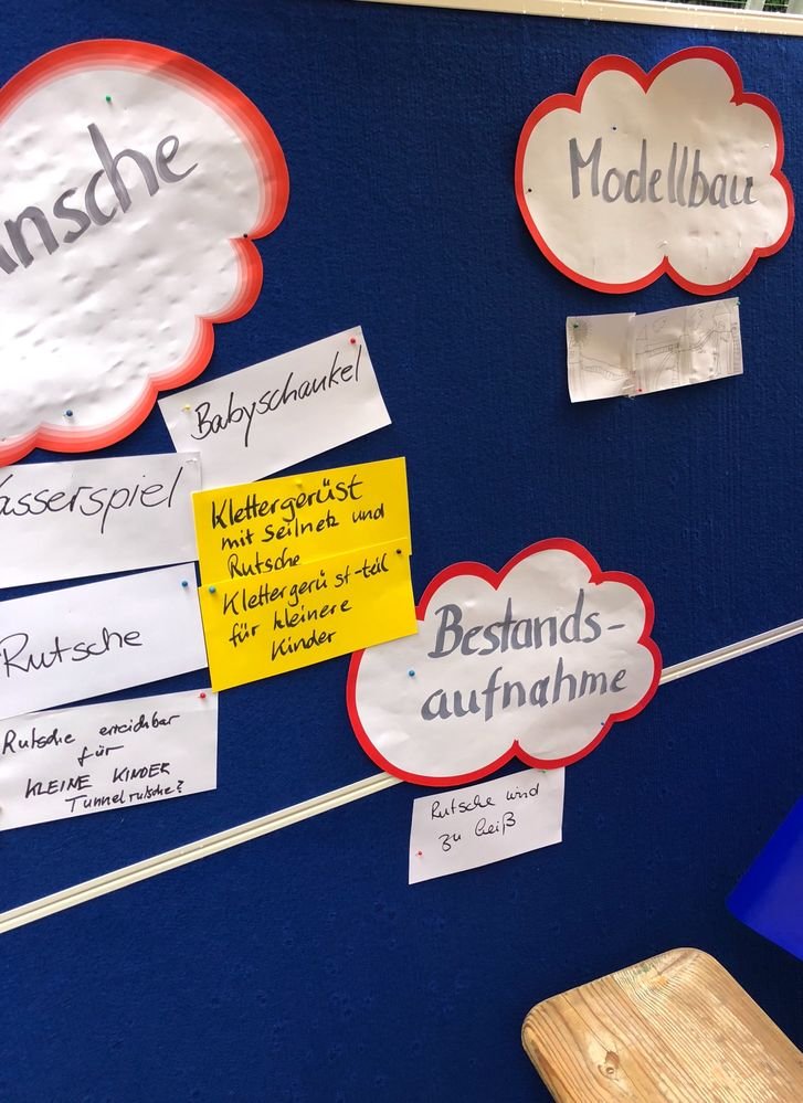 Nun hat die Spielleitplanung mit den Eltern und Kindern Ideen für neue Geräte entwickelt. Im nächsten Jahr wird der Spielplatz dann richtig super und kinderwunschgemäß.